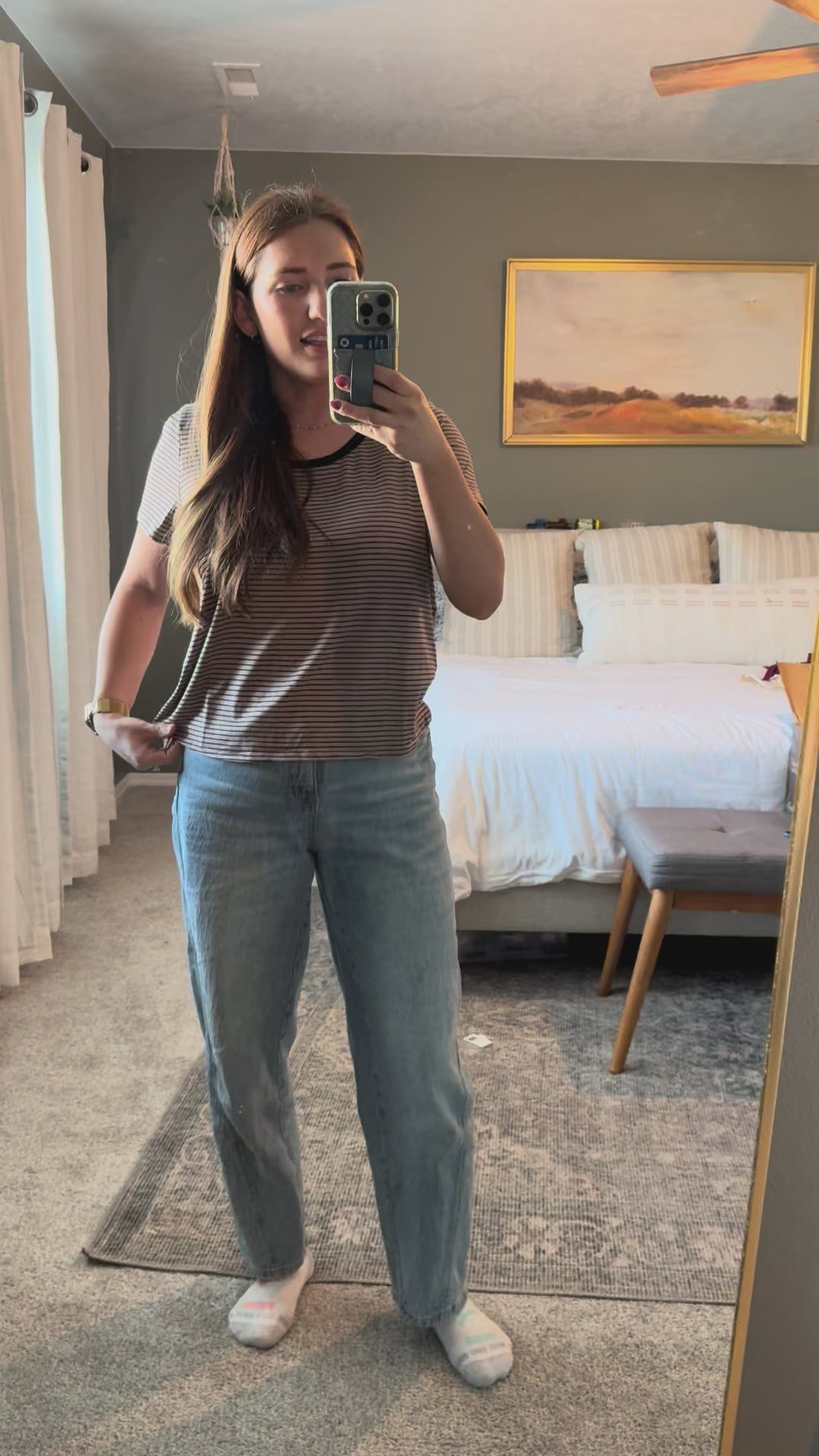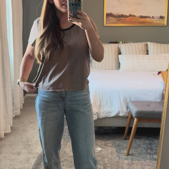 Elevate your casual look with the Basic Baddie Striped Tee, featuring classic horizontal stripes on the front and a cheeky bias stripe design on the back that adds a fun twist to your style.