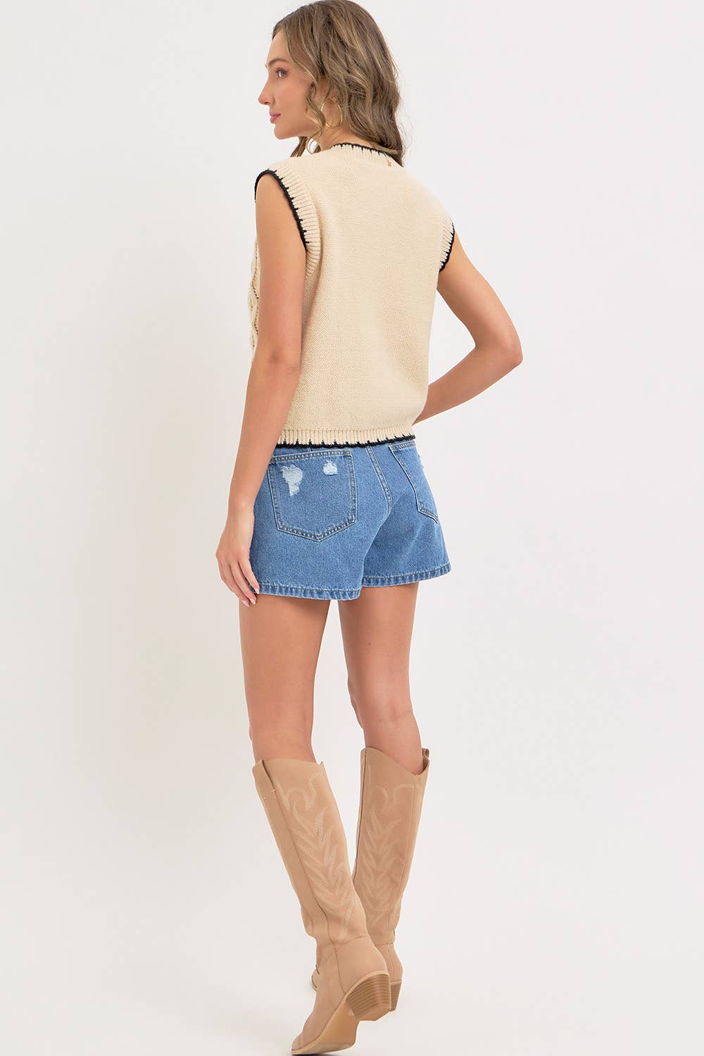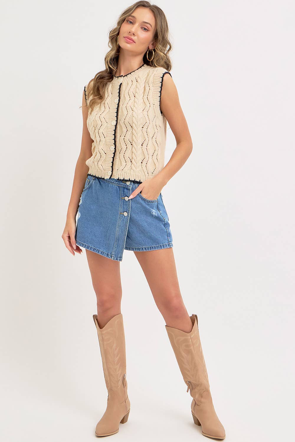 Classy, stylish and cozy? Um, yes please. Made from soft cable-knit fabric with a fun wavy texture, it has a vintage handmade vibe. The contrasting black trim adds a bold touch, and the relaxed fit makes it perfect for layering or wearing solo.