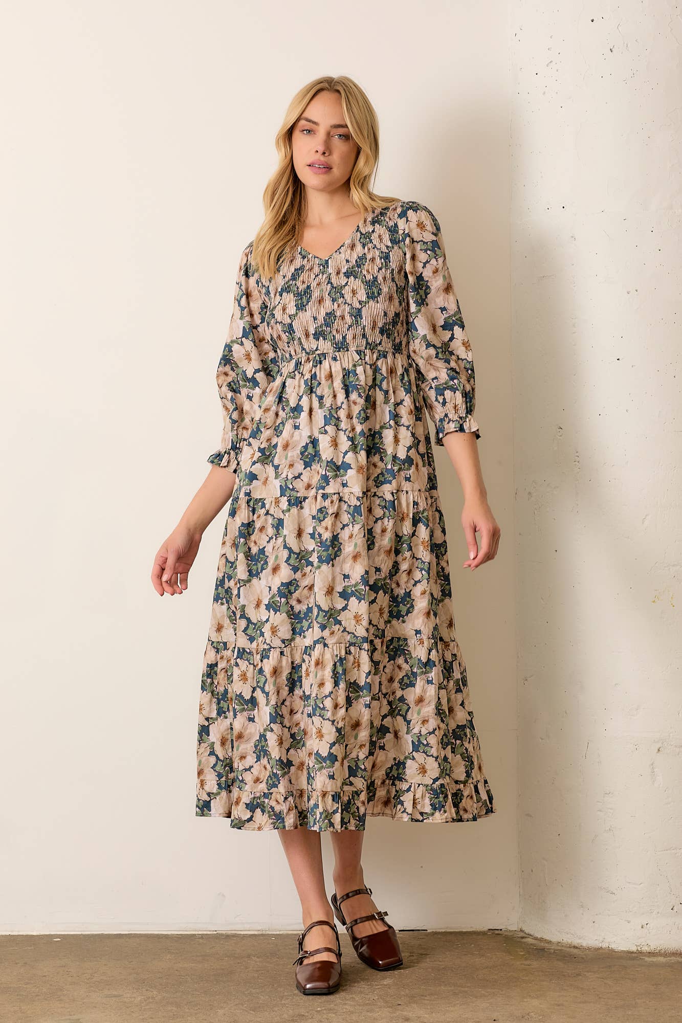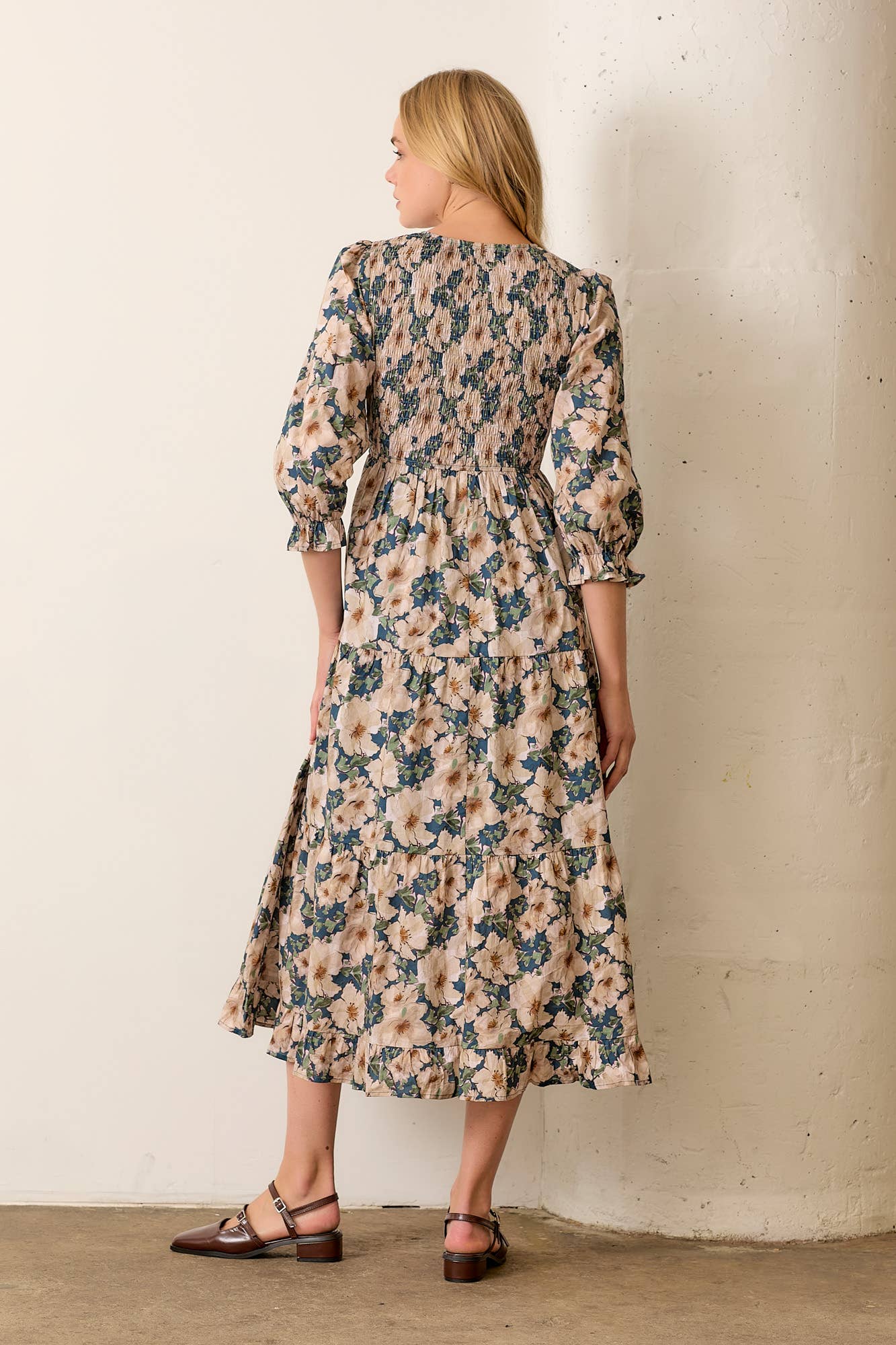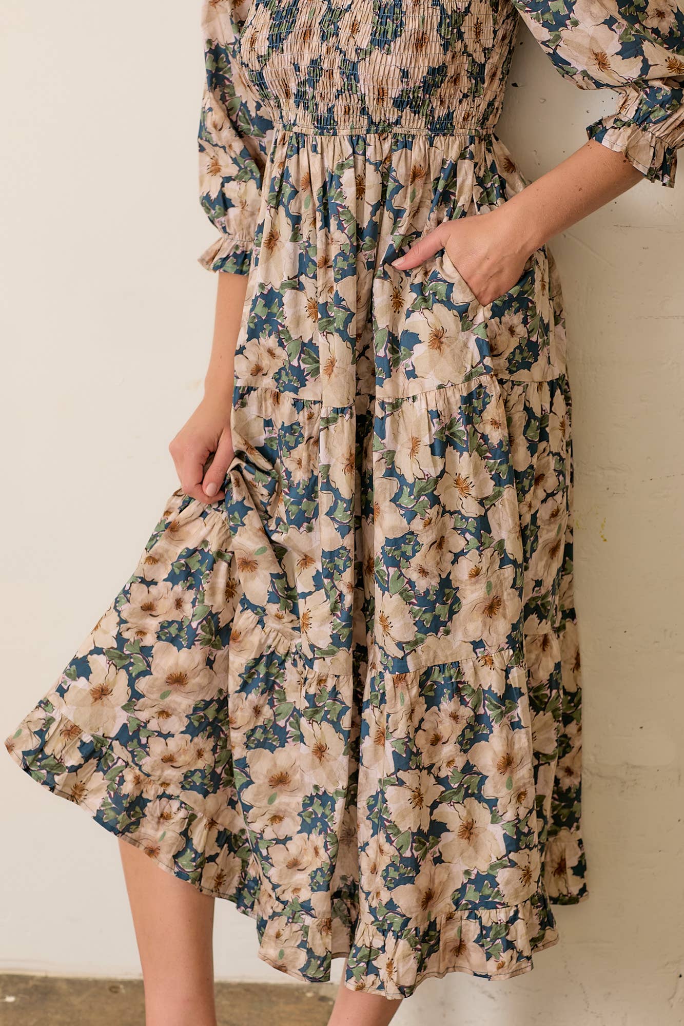 The Midnight Garden Dress shines with a cute floral print, handy pockets, and a flattering midi length and tiered skirt—perfect for adding playful charm to any day.