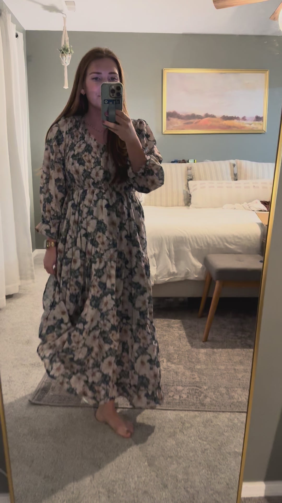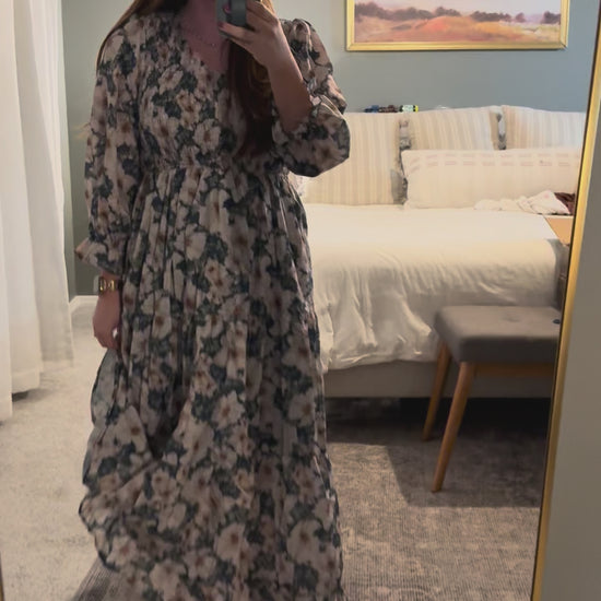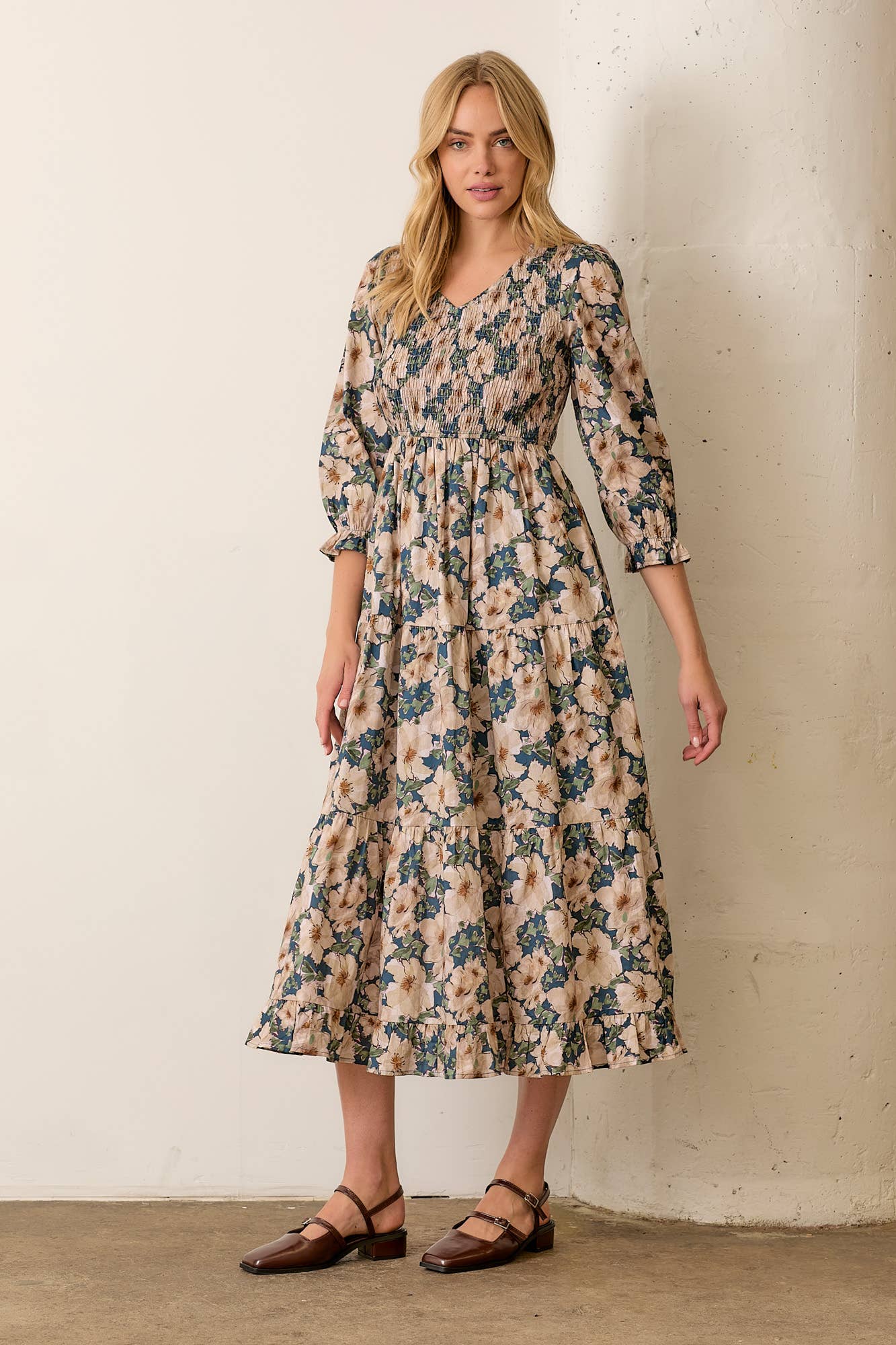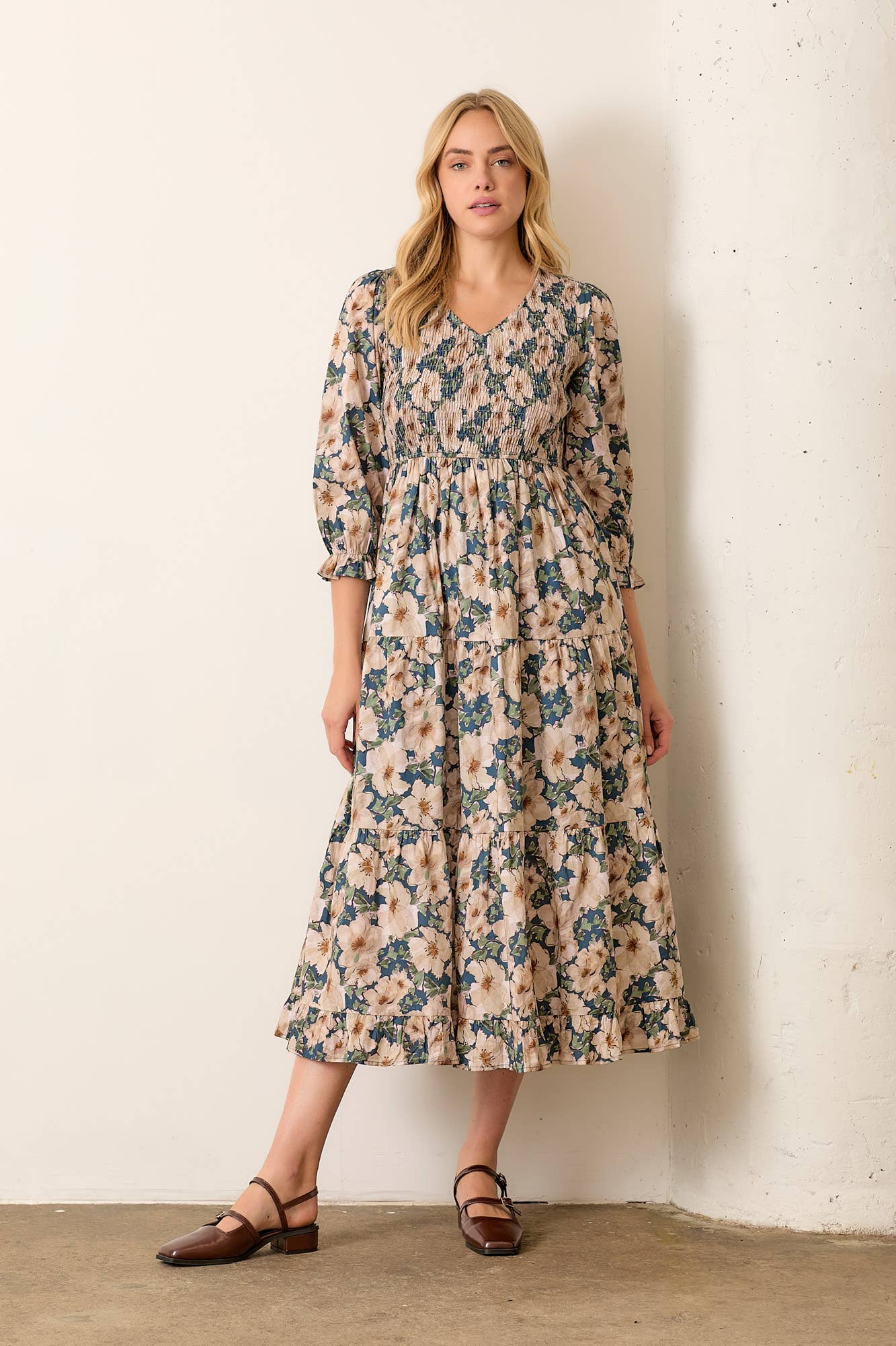 The Midnight Garden Dress shines with a cute floral print, handy pockets, and a flattering midi length and tiered skirt—perfect for adding playful charm to any day.