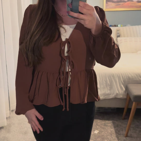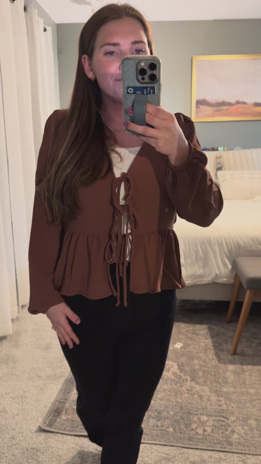 This fun long-sleeve top ties at the front, with cute shirring on the shoulders and comfy elastic at the waist and cuffs for a perfect fit.