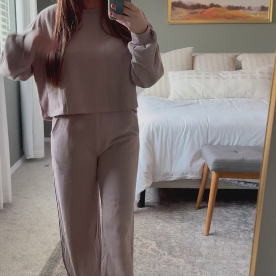 Cozy up in the Soft Rebellion Set, made from a soft brushed knit that feels like a warm, gentle hug. It comes with wide-leg pants featuring a stretchy waistband and handy pockets, paired with a cute cropped top that flaunts subtle balloon sleeves and relaxed dropped shoulders for a fun, easygoing look. Who said soft and cozy can't be feminine?