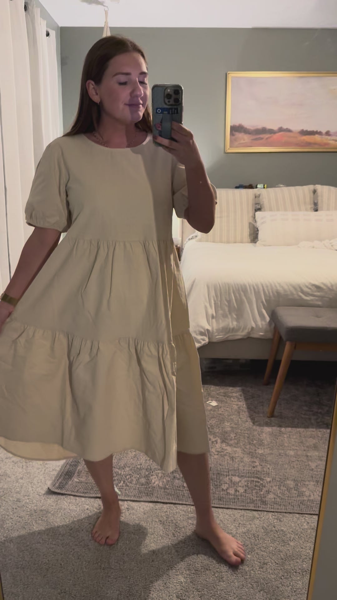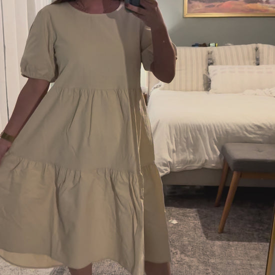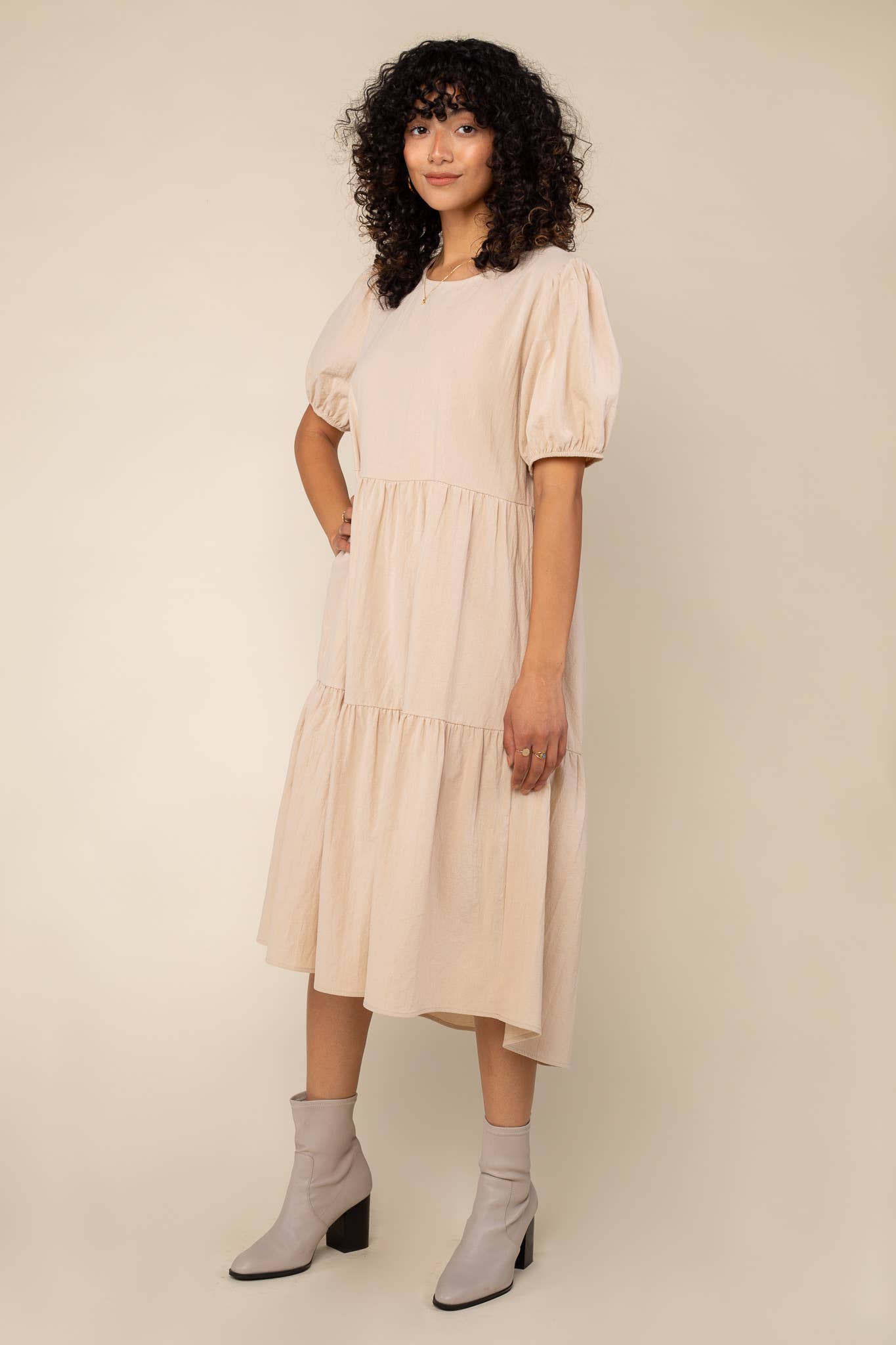 This natural beauty is a midi-length dress features a tiered design and puff sleeves, complemented by a keyhole detail at the back for an elegant finish.