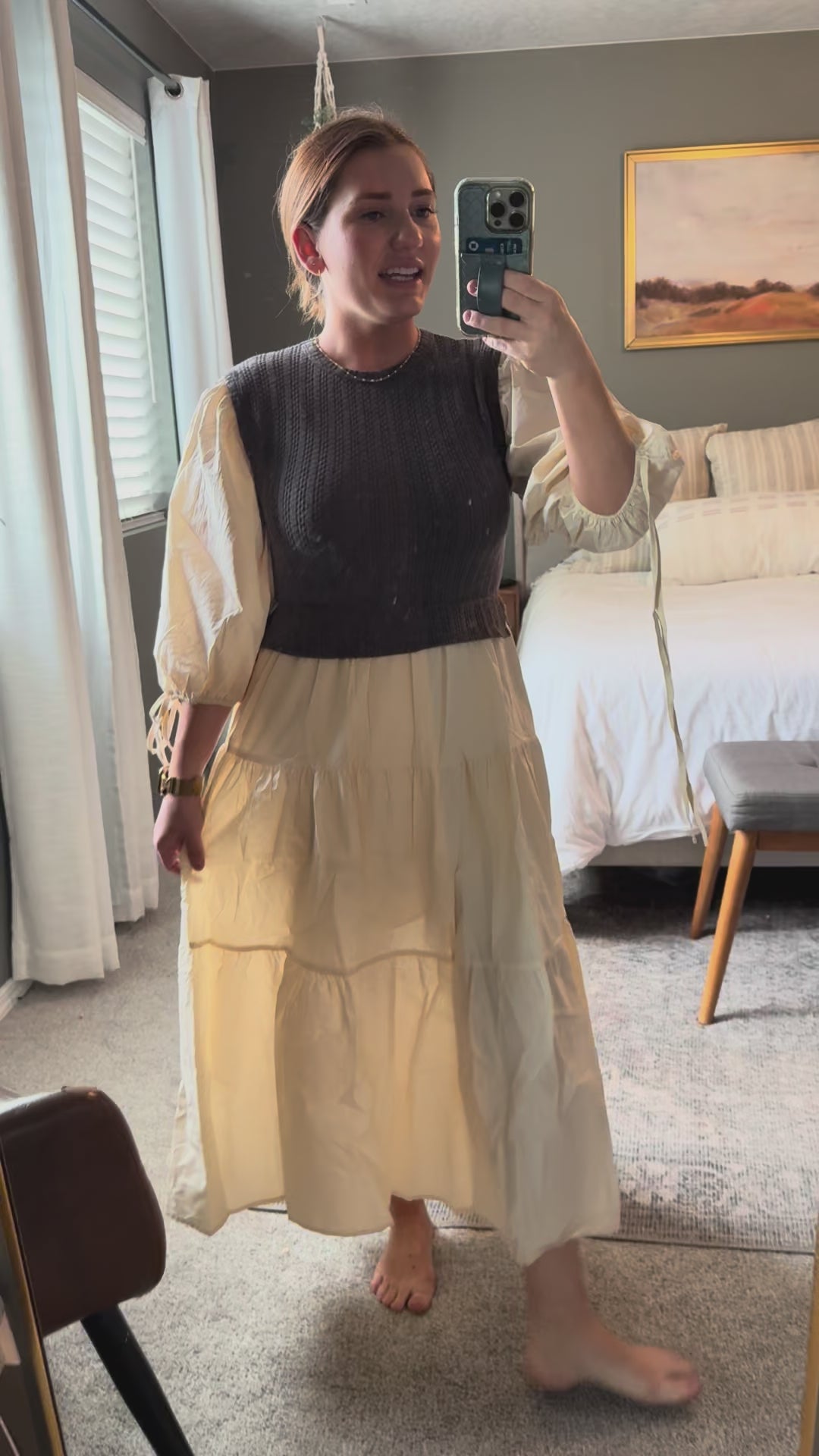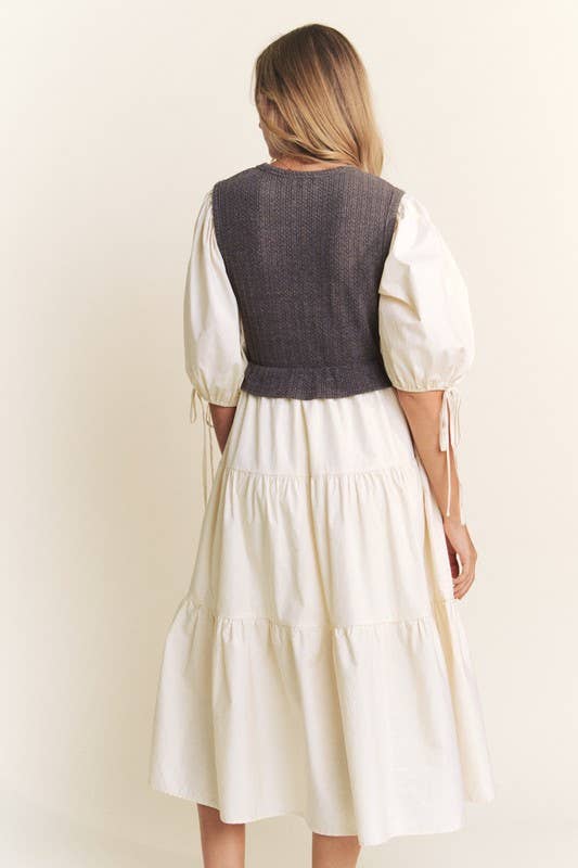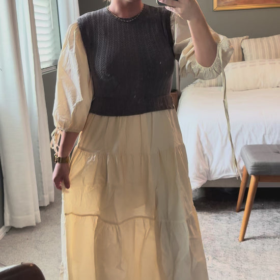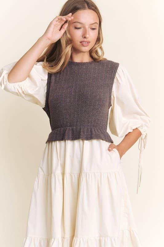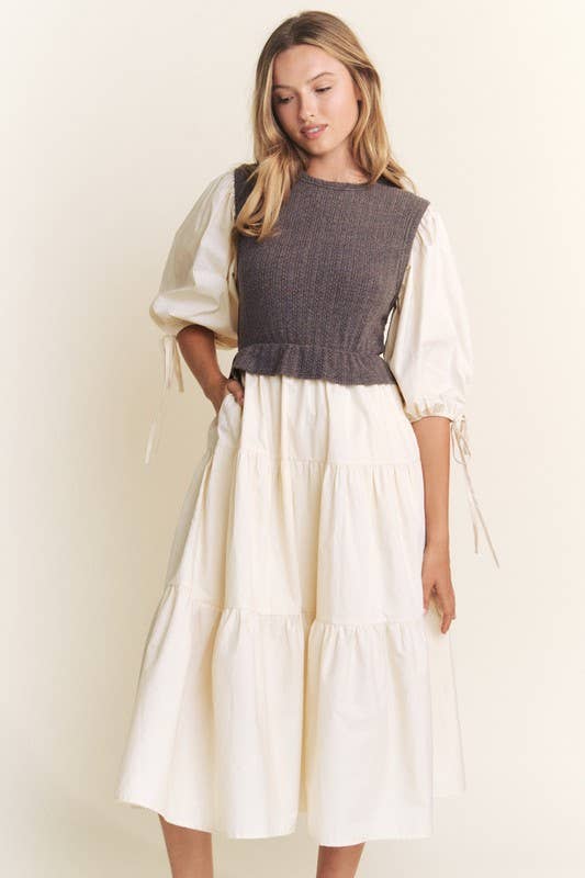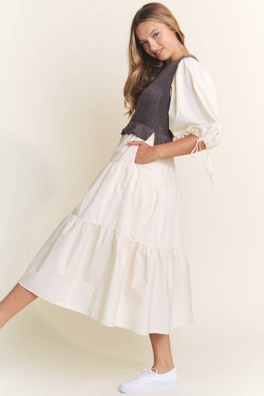 This playful mixed media tiered midi dress features a scoop neckline and a woven knit bodice for a comfy fit. With 3/4" sleeves, an elastic waist, and a handy side pocket, it’s perfect for effortless style and ease.