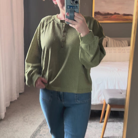 The Deanie Top is a solid knit top shows off long sleeves, a cheerful Henley neckline with buttons, and extended shoulders for a fun, relaxed fit.