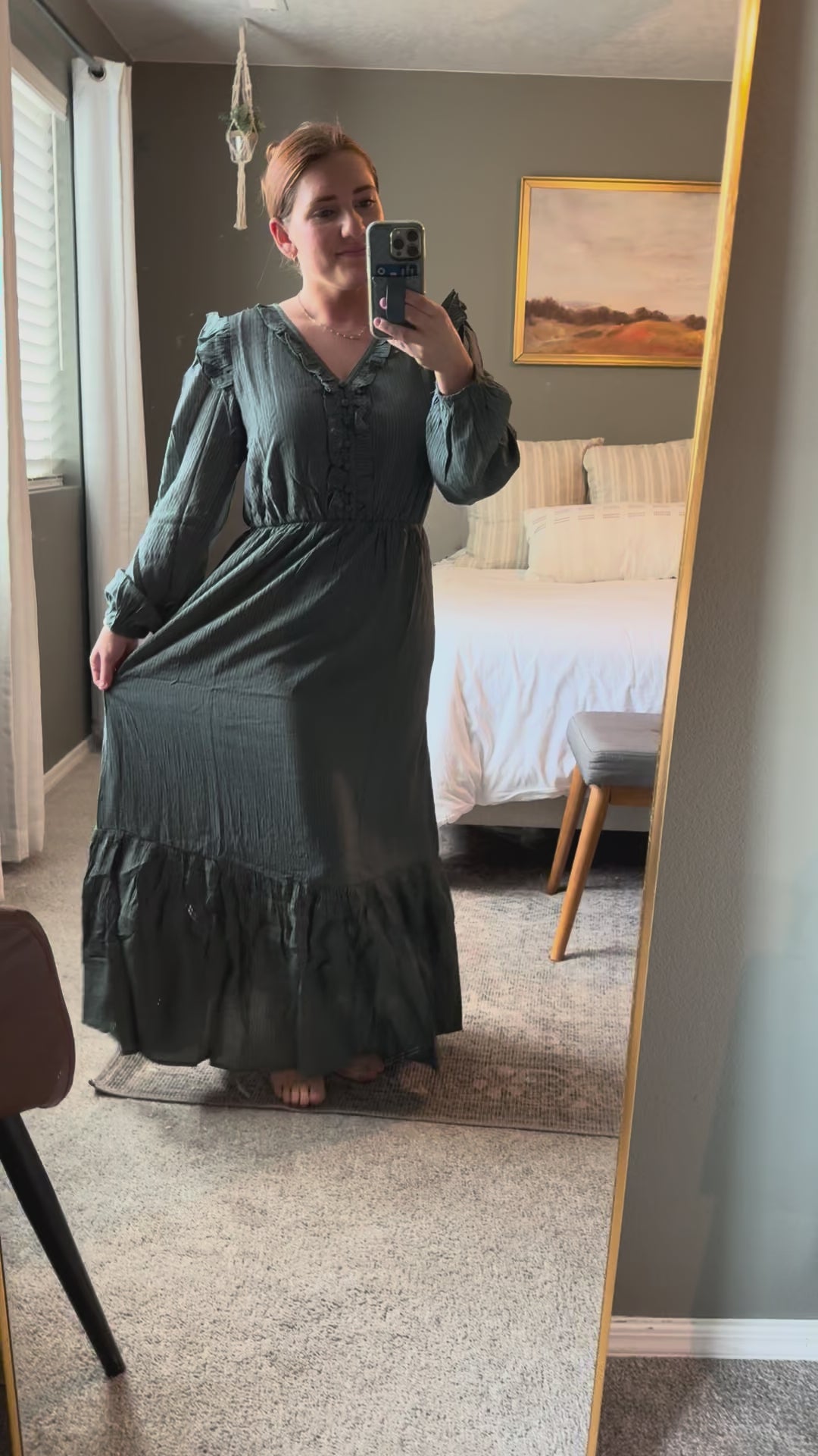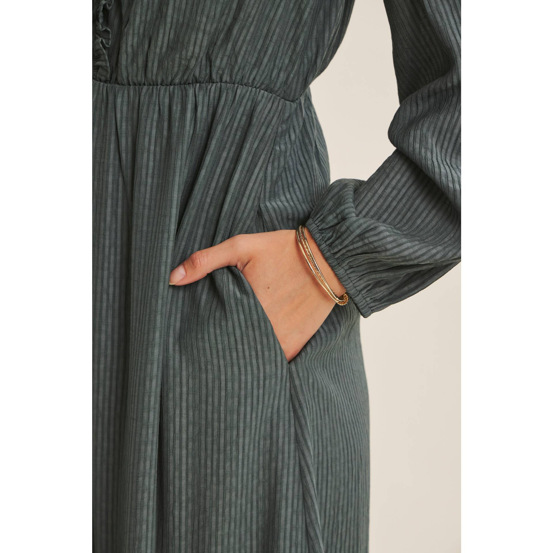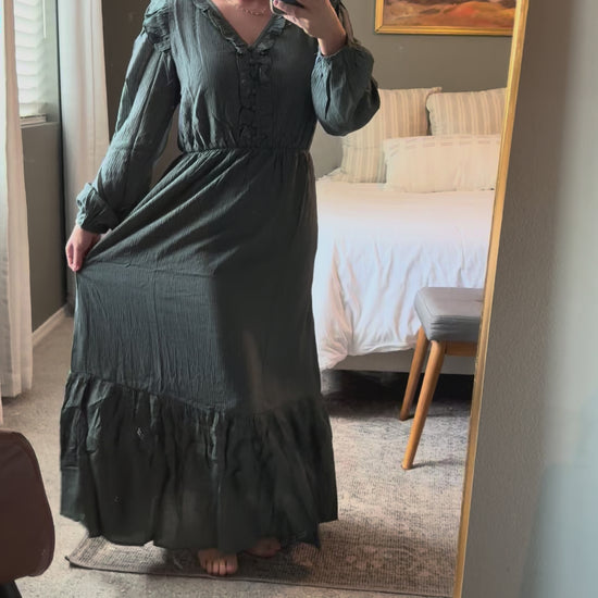 This maxi dress mixes soft texture with playful details like ruffled neck and sleeves, long balloon sleeves, and a comfy elastic waist. With buttons down the front and handy side pockets, it’s easy to wear and perfect for layering on cool days. Stylish and cozy, it’s your new favorite for fall fun!