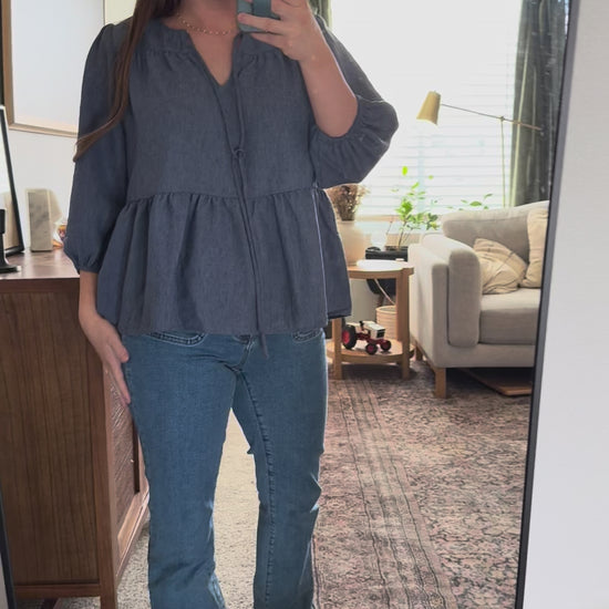 The Indigo Hour Top effortlessly blends casual denim vibes with a playful twist. Featuring a flattering tiered peplum silhouette, this top is completed with a sweet tie front detail that lets you adjust the fit while adding a touch of charm.