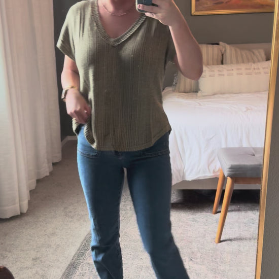 This relaxed-fit knit top features a V-neckline with extended short sleeves and ribbed detailing along the shoulders. Crafted with multicolor threads, it offers a boxy silhouette and an unlined, comfortable design with a U-shaped hem.