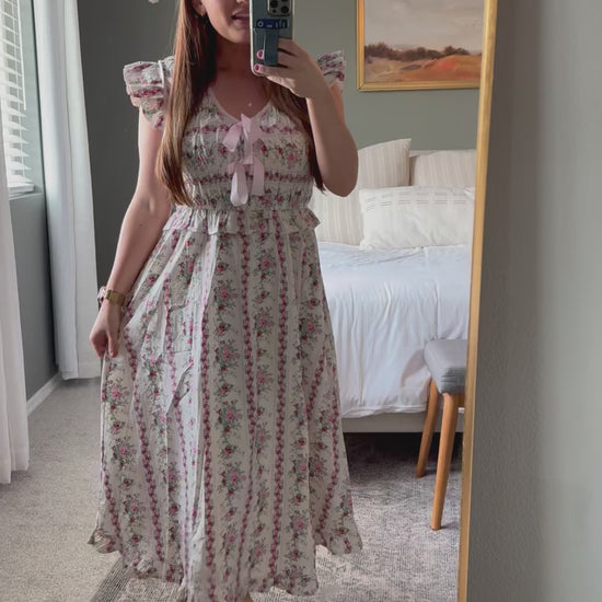 Prepare to fall in love in this floral charm. The dress showcases a flattering v-neckline, elegant flutter sleeves, and delicate satin bow accents on the bust. Get ready for your neck garden party or picnic date, this dress is ready for the outing!